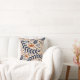 Two views of a decorative pillow with a stylized nature pattern. The design features blue and orange leaves, abstract shapes, and fox motifs on a beige background, creating a playful and cheerful tone