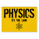 "Natuurkunde - Het is de wet!" grijze tekst met atoomsymbool, op t-shirts, knoppen, stickers, giften.