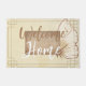 Natuurlijke kleuren bruin beige burlap scripttekst schattig doormat. Dit hormoon ziet er erg lui en natuurlijk uit. Het is een schattige bruine grafische vlinder op de achtergrond en een kleine burlap in het midden. De tekst Welkome Huis is bruin en wit maakt het model interessanter. Dit ontwerp ziet er eenvoudig uit in boerderijstijl.