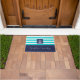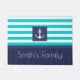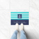 Nautische deurmat met turquoise en marineblauw gestreept patroon en aanpasbare tekst.