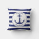 Dit nautische themakussen heeft een anker in het midden met een cirkelvormige touwrand. Het woord "Captain" is boven en onder een naam om te personaliseren. Achtergrond is marineblauw met witte strepen.