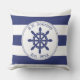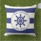 Personaliseer de naam van de boot en het jaar van vestiging op dit nautische kussen met een marineblauw kapiteinswiel met een cirkelvormige touwgrens. Achtergrond is blauw met witte strepen. De achterkant van het kussen is marineblauw.