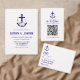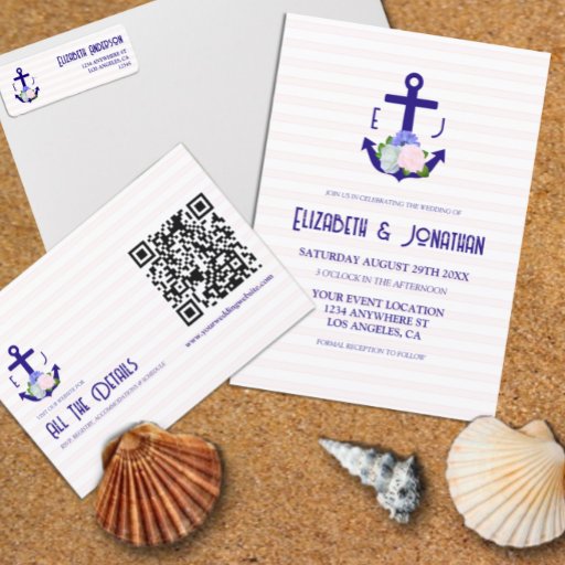 Nautical anchor and monogram framed by a lightened version of patriotic florals: white rose, blush pink peony and light blue. Preppy pink and white stripes for a summer, beach, or destination wedding event.