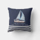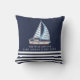 Modern nautisch gepersonaliseerd kussen voor een meerhuis, een boot of een strandhuis met een zeilbootillustratie, strepen en sjabloon tekst aan te passen met uw familienaam, jaar vastgesteld of andere tekst.