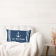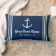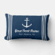 Nautical lumbar werpen kussen in een horizontaal formaat met een elegant bootanker met preppy horizontale strepen. Pas de aangepaste tekst aan met de naam en locatie van uw boot. Het ontwerp omvat een klassiek blauw- en witkleurenschema voor de kustmarine.