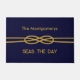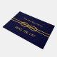 Nautical Navy Blue Gold Rope Custom Names Doormat. Customize with your name and your boat name! Classic nautical design to elevate your boat or home decor Great gift idea for the boater in your life.