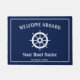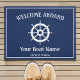 Een bootmat van de stijl "Welkom aan boord". Met een blauw marineklierachtergrond is er een witte grens en in het midden een wit afbeelding van de helm/het wiel van een boot. Bovenop, in moderne witte typografie is "Welkoms Aboard"en onderaan kunt u gemakkelijk aanpassen met uw botennaam evenals plaats.