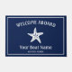 Een bootmat van de stijl "Welkom aan boord". Met een blauw marineschaal is er een witte grens en in het midden een wit afbeelding zeester. Bovenop, in moderne witte typografie is "Welkoms Aboard"en onderaan kunt u gemakkelijk aanpassen met uw botennaam evenals plaats.