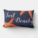 Trendy hand lettered scriptwoord "Just Beachy" in witte en rode oranje zeester over een donkerblauwe achtergrond. De achterkant van de kussen heeft een hoop rode oranje zeester.