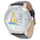 Een levendig nautisch ontwerp met een moderne grafische zeilboot met heldere zeilen en tekst. Dit object is een mooi cadeau voor eigenaars van boten, liefhebbers van cruiseschepen of iedereen die graag op het water staat.
