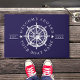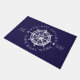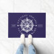 Nautical Ship Wheel Boat Name Welcome Aboard Doormat. Sail into style with this customizable nautical doormat, designed to welcome guests aboard your beloved boat. The striking white ship's wheel emblem is a timeless symbol of seafaring, beautifully contrasted against a rich navy backdrop. Personalize it with your boat's name and establishment year for a truly bespoke touch. This doormat serves as a charming announcement of your maritime lifestyle and ensures every arrival begins with a warm, sea-faring greeting, perfect for any captain's quarters.