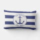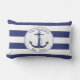 Dit nautische kussen heeft een marineblauw anker met een cirkelvormige touwrand. Personaliseer met uw eigen familienaam en vestigingsjaar, of vervang deze door andere tekst. Achtergrond is marineblauw en witte strepen. Ontwerp aan beide zijden van het kussen.