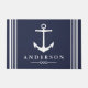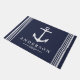 Ankers weg! Begroet uw gasten met deze verklaring die een witte nautische ankerdeurmat maakt. De achtergrond is een donkere marineblauwe kleur met gepersonaliseerde familienaam tekst in het wit. Deze deurmat is elegant, chique en zou een grote indruk maken op uw huisgasten, omdat ze bij u thuis worden verwelkomd!
