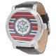 Nautisch ontwerp met versiering van kompassen in ronde vorm op rode, blauwe en witte gestreepte achtergrond