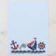 Grafische illustratie van het nautische patroon van zeilboot, scheepswiel, anker en walvis op het water.