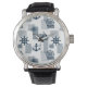 Naadloos scheepvaartontwerp met zeilboot, kompas, anker en zeilwieldecoratie op blauwe en witte geometrische achtergrond