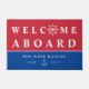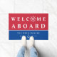 Nautische deurmat voor je boot in rood en blauw met welkom aan boord, in wit. De "o in welkomstwoord" wordt vervangen door een scheepswiel. Geef de bootwelkomstmat een persoonlijk tintje met de bootnaam.