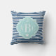 Nautische marineblauw en witte gestreepte gooipijp. Gepersonaliseerde 3-letterige monogram gooien kussen met het turkooisblauw quatrefoletiket. rechte kussens voor de bank, de bus, het bed of de boot. achtergrondkleur. Blauw en witte strepen. Aangepast thuisdecor met klein scheepsanker en wit hart.
