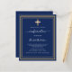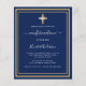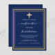 Een moderne, elegante en uitnodiging. Een marineblauwe achtergrond versierd met een gouden kruis en lijsten. Personaliseer en voeg een naam en details toe. Witte tekst. 1 vel = 1 uitnodiging afgedrukt rand tot rand.