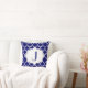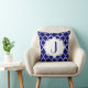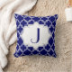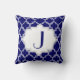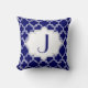 Navy blauw, wit quatrefoliepatroon gooit/gooit decoratieve kussens met een modern Marokkaans roosterpatroon met een monogram in een grijs lijst.