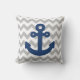 Een eenvoudige vorm van een blauw marineveranker tegen een licht grijs en wit chevron- of zigzagpatroon. U kunt de lichte grijze achtergrondkleur veranderen als u andere nautische kleuren op dit kussen wilt proberen. Schrap het zigzag naadloze tegelvormige afbeelding als u een stevige kleurenachtergrond zou verkiezen. Houd de buitenstof en breng deze kussens met u mee op de boot, of kies een andere fabric-optie voor thuisdecor. U kunt het afbeelding aanpassen en een gepersonaliseerd tekstbericht voor een paar toevoegen, of het afbeelding van de de klemkunst van het anker roteren aan een hoek van 45 graden.