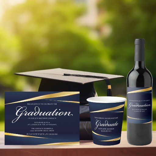 Deze elegante marineblauw- en goudgraduatie-partij begunstigt de vakken moderne geometrische lijnen rond uw formele tekst. Het klassen witte manuscript detailleert uw afstuderen school en klasseninformatie. Deze schaalbare doos is perfect voor een Klasse van 2023 college of universitair afstudeerder.