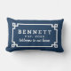 Het stijlvolle lumbale kussen is voorzien van een wit Grieks, geometrisch grensontwerp en een monogram dat gepersonaliseerd kan worden met een getrouwde of familienaam, een datum die is vastgesteld voor het jaar dat het lijst is gehuwd of het jaar dat het eerste kind is geboren. Pas de blauwe achtergrond van de marine aan om met uw openluchtdecor te coördineren.