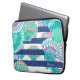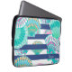 Dit unieke laptop hoesje heeft een prachtig blauwgroen groen, goud, roze en wit zeeschelpenpatroon gelegd over en onder een marineblauwe streep achtergrond. Jouw naam of andere tekst is in wit schrift rechtsonder.
