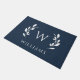 Navy Blue Wreath Initiaal Monogram Achternaam Doormat toont handgetekende lauweren tegen een blauw marineklein, met uw familienaam en initiaal.