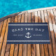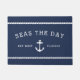Welkom gasten aan boord van je boot met dit coole aangepast hormoon met je naam op de boot en je scheepsregistratie in witte letters op een klassieke blauw marineklein. De witte touwrand en een ankerillustratie voegen nautische flair toe.