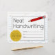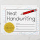 Een leslokaalgunningscertificaat om studenten te belonen voor hun mooie handschrift. Achtergrond is notitieboek papier illustratie. Het ontwerp omvat ook illustraties van een rood potlood en een gouden zegel.