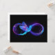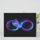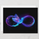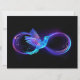 Paarse oneindigheid met een gloeiend symbool, met een lichte, blauwe kolibrie op zwarte achtergrond. Neon.