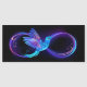 Paarse oneindigheid met een gloeiend symbool, met een lichte, blauwe kolibrie op zwarte achtergrond. Neon.