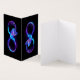 Gloeiend, paars oneindigheidssymbool met vliegende, lichtgevende, blauwe kolibrie op zwarte achtergrond. Neon.