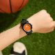 Modern horloge voor kinderen in neon oranje effen kleur achtergrond en een cover logo. Personaliseer het nu. Modern en trendy design van Alma Wad.