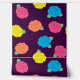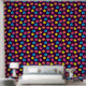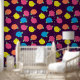 Stijlvolle rozen in helder neonroze, blauw, geel en koraal met neongroene bladeren worden over een diepe paarse achtergrond gespoeld om een leuk floreel patroon te creëer.