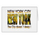 Het New Yorkse ontwerp met een deel van de skyline in de Midtown, die door grote NY-letters en gezegde "De stad slaapt niet..."