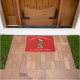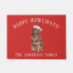 Schattige kerstdeurmat met een Newfoundland Dog met een kerstmuts op een feestelijke rode achtergrond.
