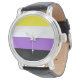 Niet-binaire personen kunnen zich identificeren als personen met twee of meer geslachten, zonder geslacht, met een verplaatsing tussen geslachten of met een fluctuerende geslachtsidentiteit, of met een derde geslacht of een andere geslachtsvorm, een categorie die ook personen omvat die geen naam aan hun geslacht geven. Elke streepkleur vertegenwoordigt verschillende soorten niet-binaire identiteiten: Geel voor mensen die zich buiten het geslachtsgebonden binaire getal identificeren, wit voor niet-binaire mensen met veelvoudige genders, paars voor hen met een mengsel van zowel mannelijke als vrouw genders, en zwart voor geslachtsorganen.