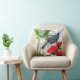 Een kussen met een Nieuw-Zeelandse inheemse vogel, de Kakako, erop, samen met inheemse planten en bloemen.