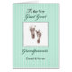 Een nieuwe baby heeft zijn stempel op de wereld gedrukt. Wat een mooie tijd voor grote grootouders om hun nieuwe grote grootkind te ontmoeten. Zachte groene strepen vullen de achtergrond, met voetafdrukken aan de voorzijde weerspiegelen deze nieuwe realiteit. De perfecte kaart om de nieuwe grote grootouders te feliciteren.