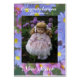 Gefeliciteerd, je hebt een nieuwe zustekst op een lila blanco kaart met kleine pop in lila kleding in tuintafels met florale achtergrond