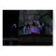Twee nieuwsgierige kraaiende feeën inspecteren een gloeiende paarse baan terwijl hun raven vriend kijkt.