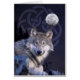 Een nachtscène van een wolf. Op de achtergrond is een volle maan en een Keltische knoop.