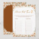 Breng plezier en gelach naar je vrijgezellenfeest met deze Name That Tune-spelkaart. Gasten zullen genieten van het raden van liedjes tijdens het vieren van de bruid-to-be. Ontworpen met warme terracotta bloemen en rustieke boho charme, het is de perfecte interactieve activiteit voor uw huwelijksdouche.