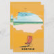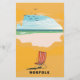 Een plattegrond met een Norfolk-retro-stijl, een reisposter van een zandig strand en een dekstoel.