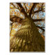 Kaart met foto's van eikenbomen die opkijken naar de enorme afgedekte boomstam en takken en de kroop van gele bladeren met blauwe hemel achter