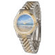 Deze prachtige oceaanliefhebber polshorloge is perfect voor zomervakantie aan de kust. Kleine blauwe golven rollen omhoog op een prachtig strand onder wolken. Ik hou van vakanties op zee.