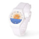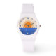 Prachtig elegant polshorloge met minimalistische scène van oceaan en ondergaande zon. Deze eenvoudige illustratie toont de serene schoonheid van een ondergaande zon aan de oceaan. De golven zijn eenvoudige gebogen lijnen, beginnend vanaf de onderkant van de illustratie en zich naar boven uitstrekkend naar de horizon lijn. Verschillende tinten rijk blauw voegen toe aan de dynamiek van het zee. De zon is een grote cirkel die gloeit in een briljant sinaasappel en in de oceaan doopt. De zon- en oceaangolven zorgen voor vibes en een rustige creëer-scene en een stijlvol design.