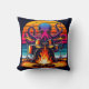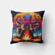 Een octopus speelt vrolijk de trommels bij een warm kampvuur met levendige zonsondergangkleuren en golven op de achtergrond.